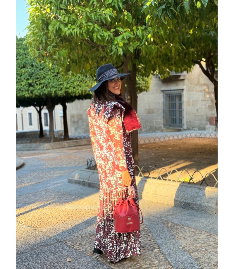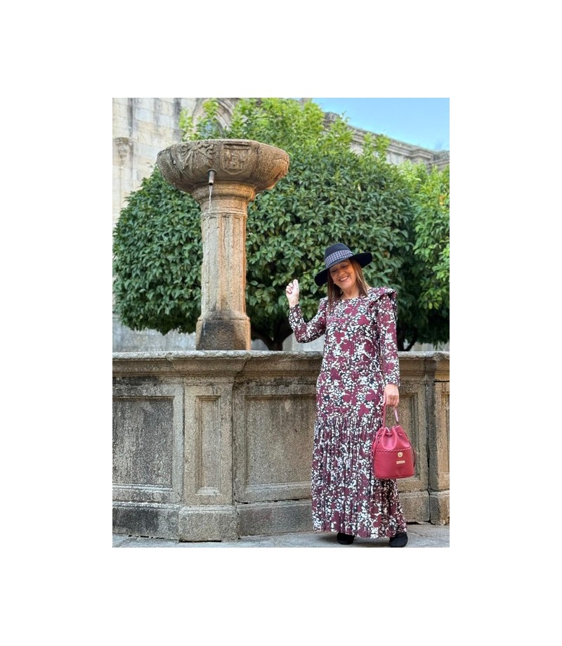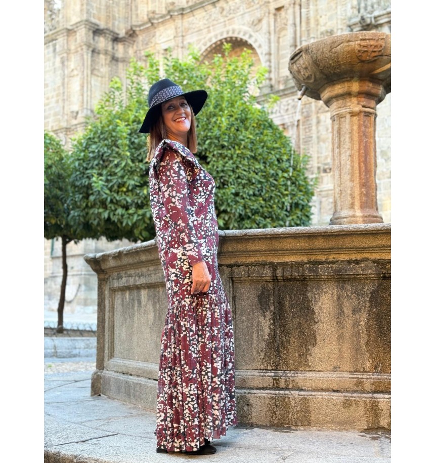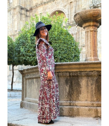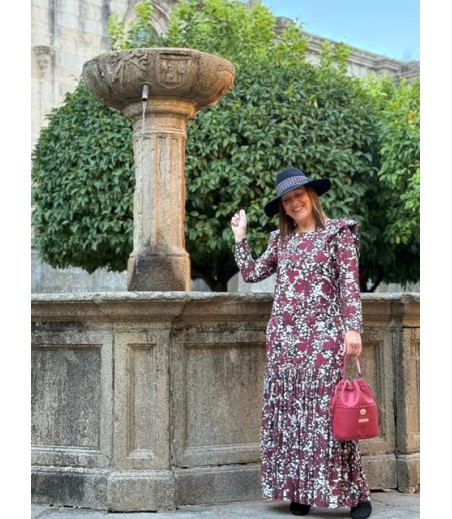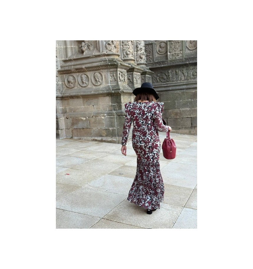 Romantico y elegante, este vestido largo en tono burdeos con estampado floral es perfecto para destacar con estilo.