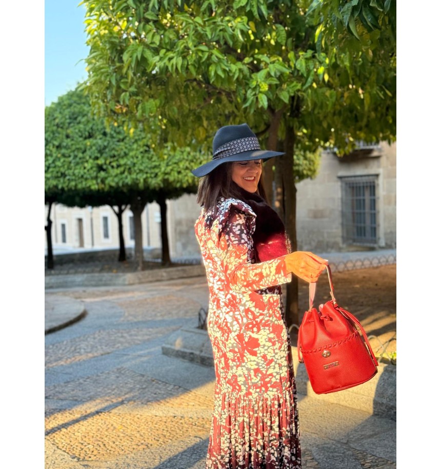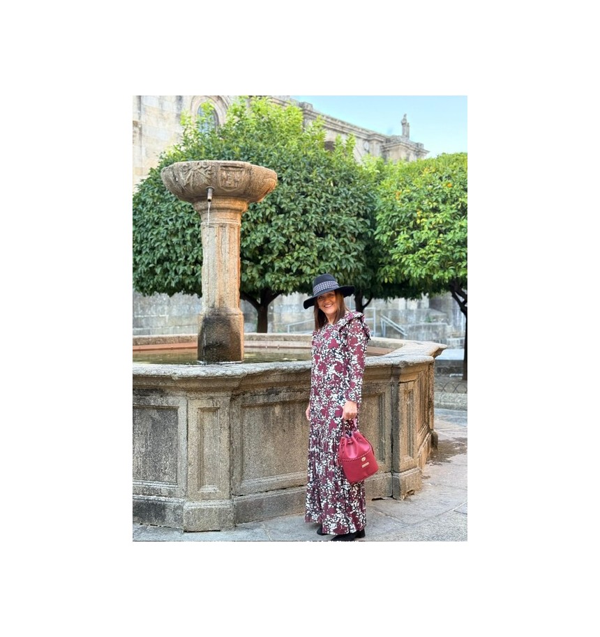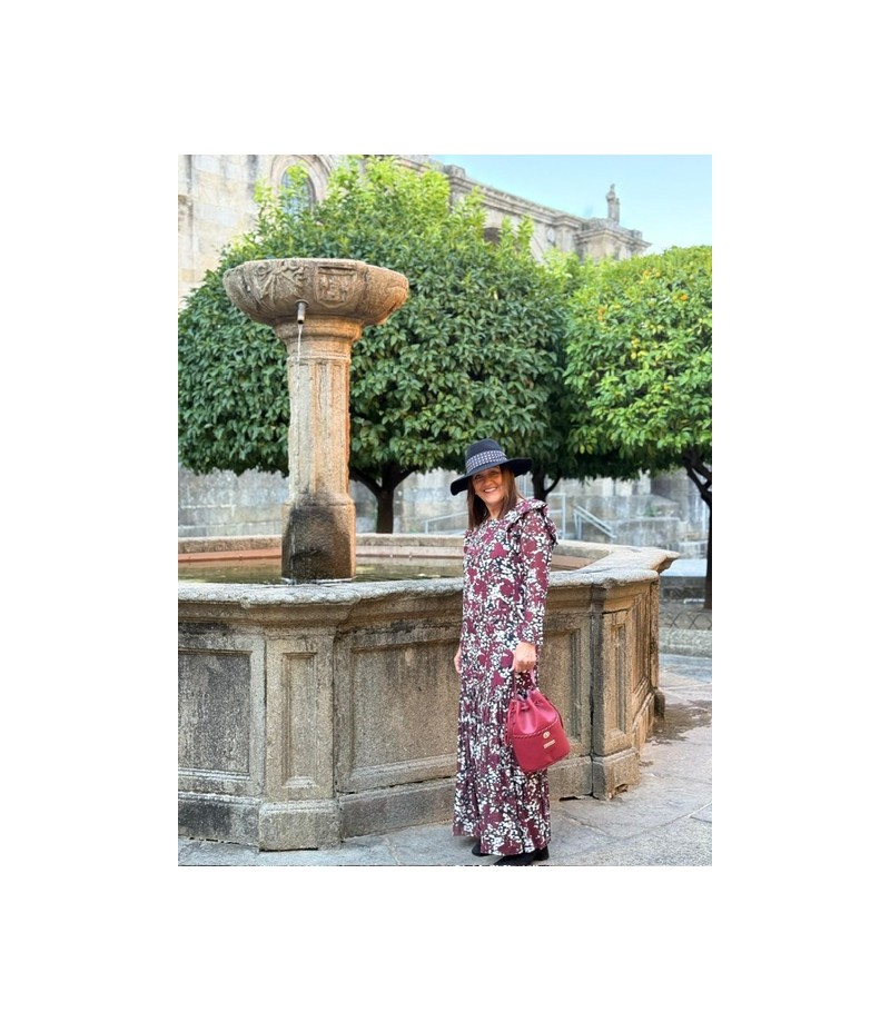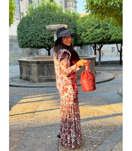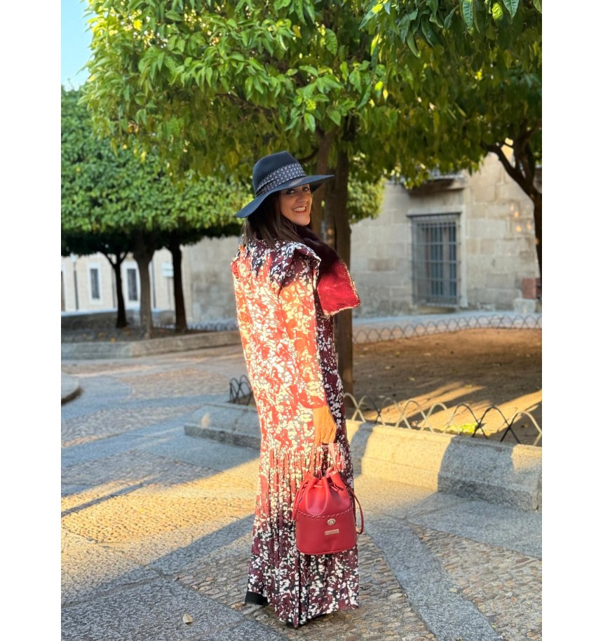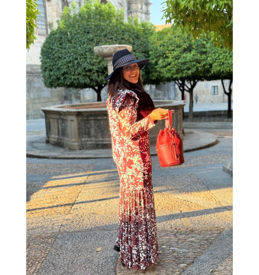 Romantico y elegante, este vestido largo en tono burdeos con estampado floral es perfecto para destacar con estilo.