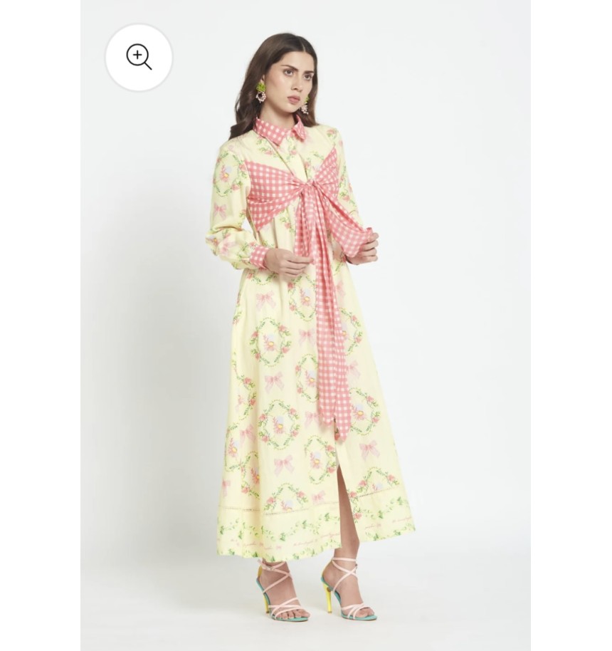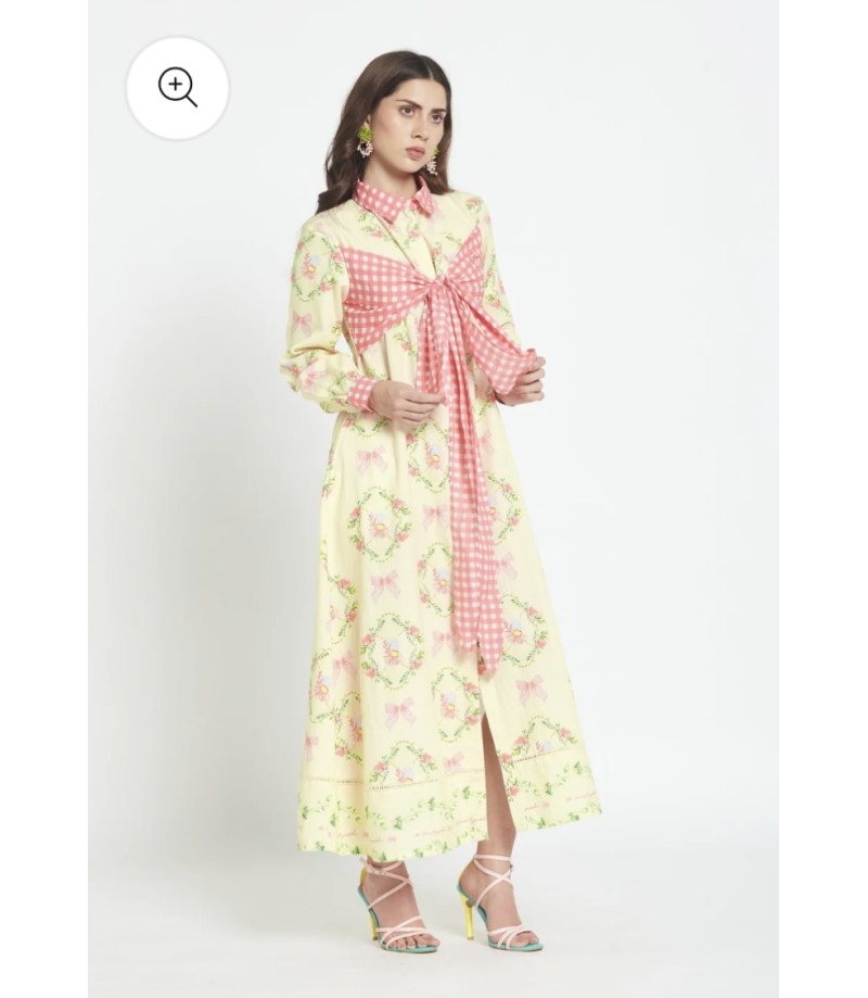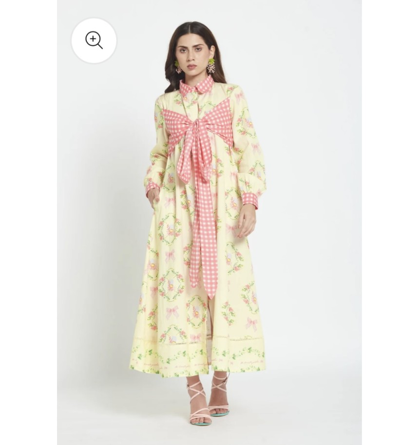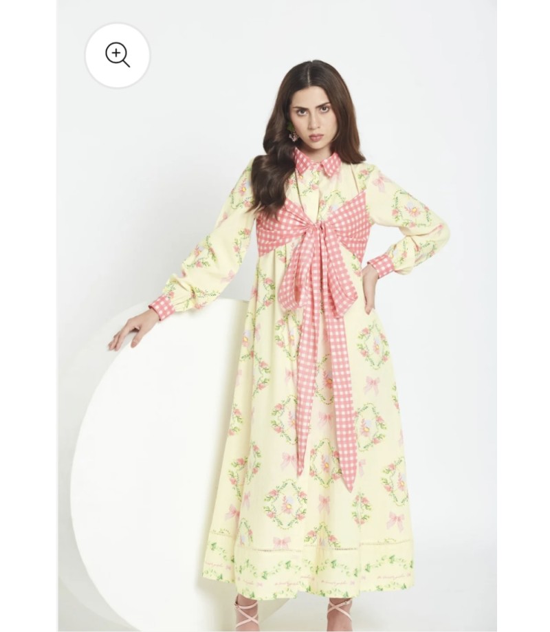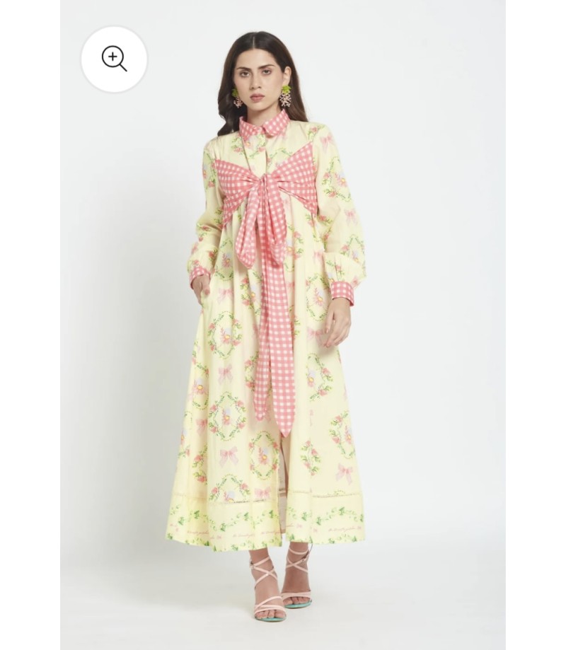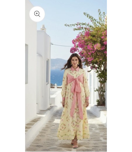 Confecionado en un delicado estampado floral sobre fondo suave, destaca por su gran lazada central en tejido vichy rosa, que aporta personalidad y aire romantico