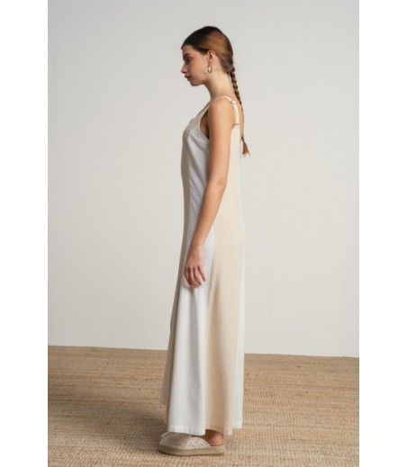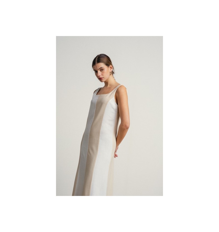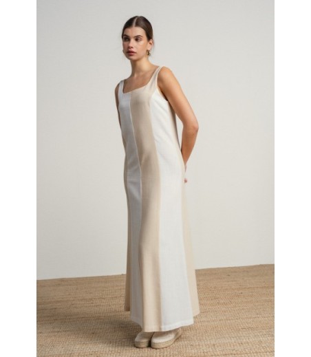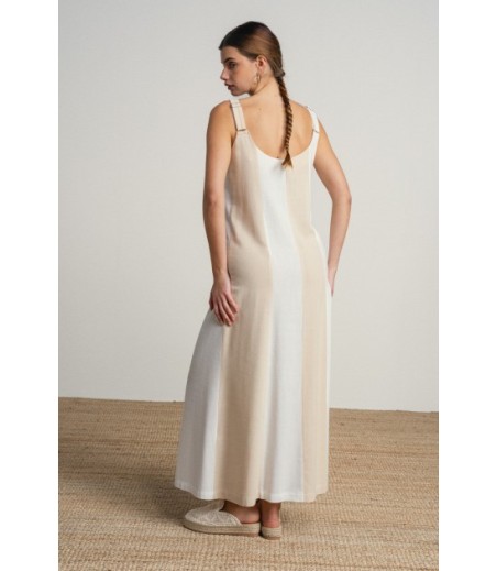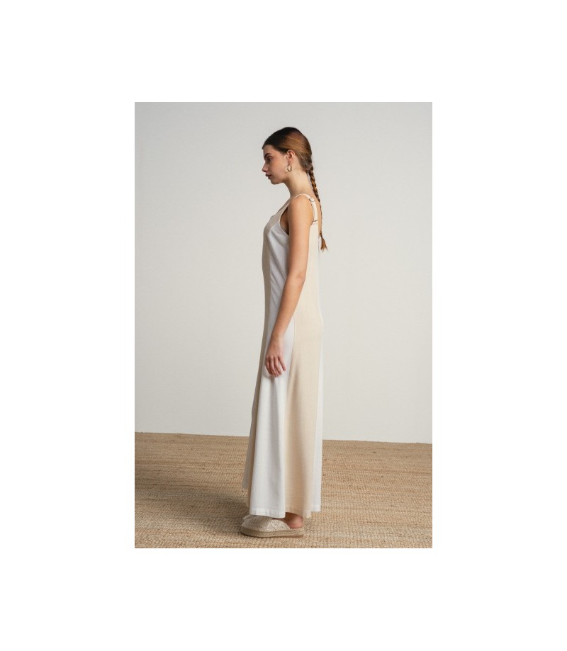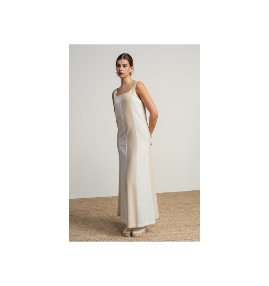 Vestido largo en lineas sencillas y elegantes en tonos neutros bicolor.