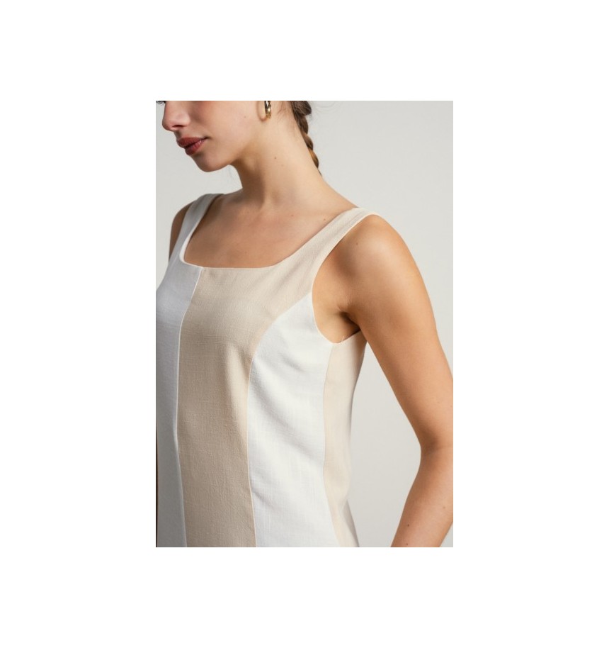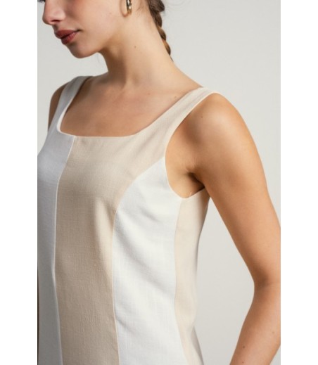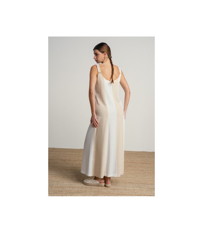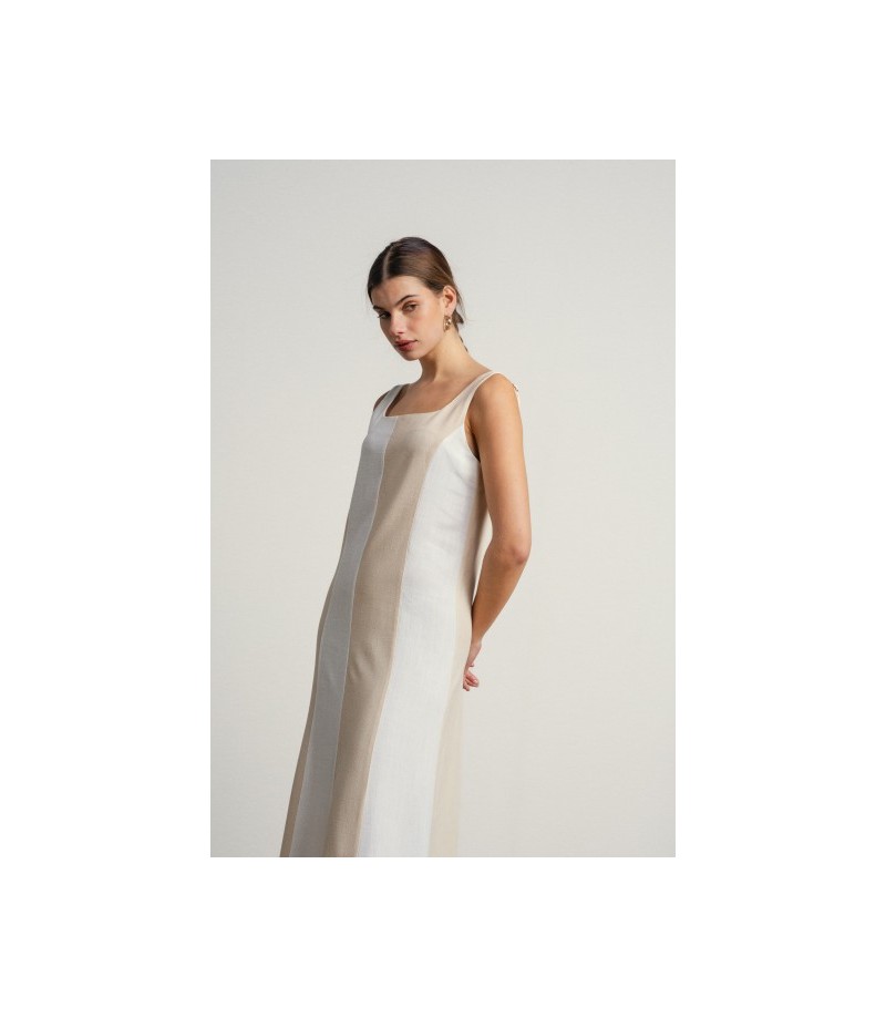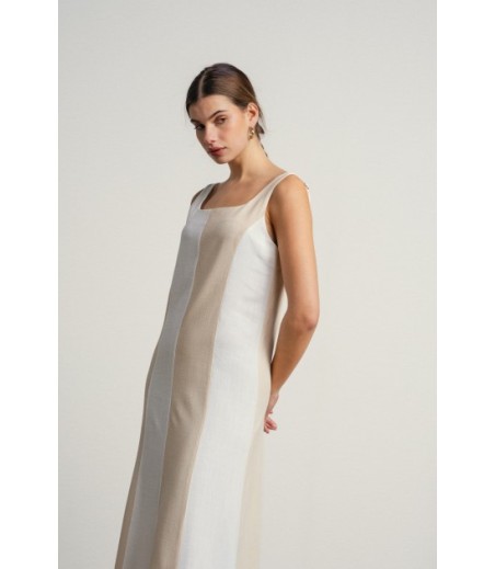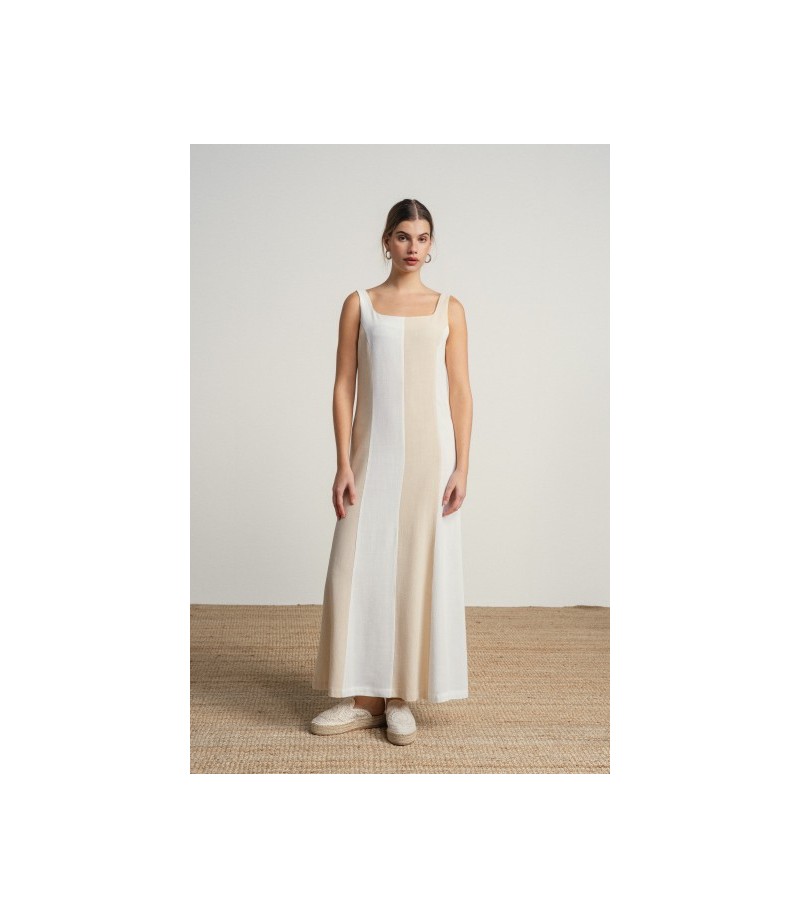 Vestido largo en lineas sencillas y elegantes en tonos neutros bicolor.