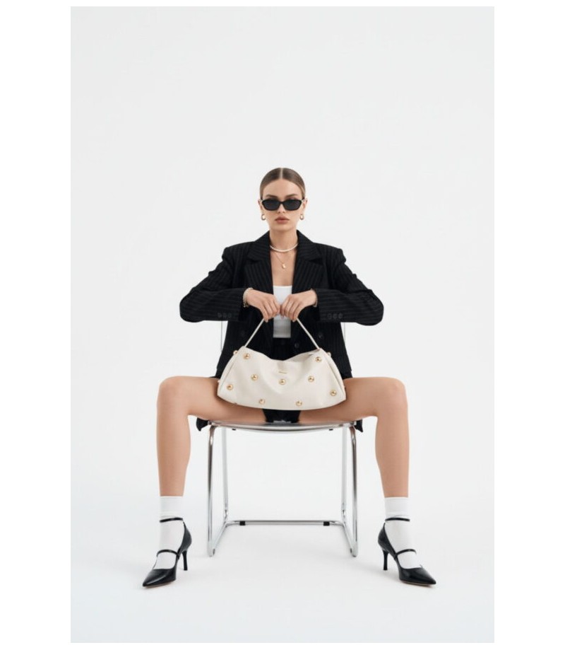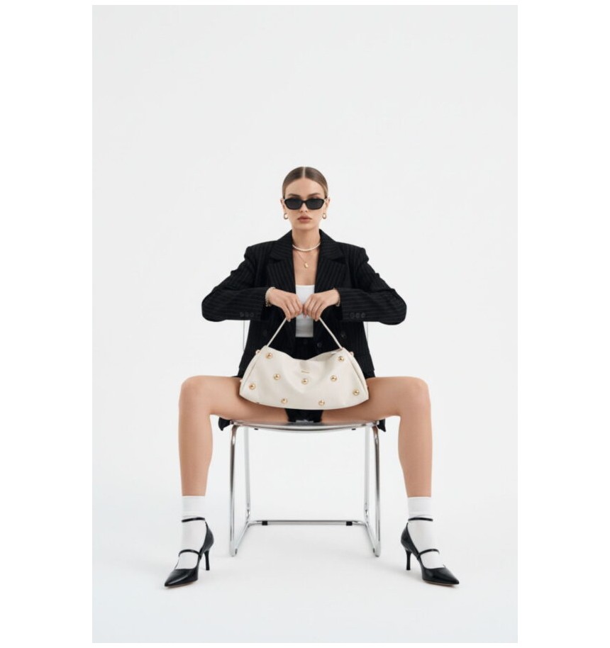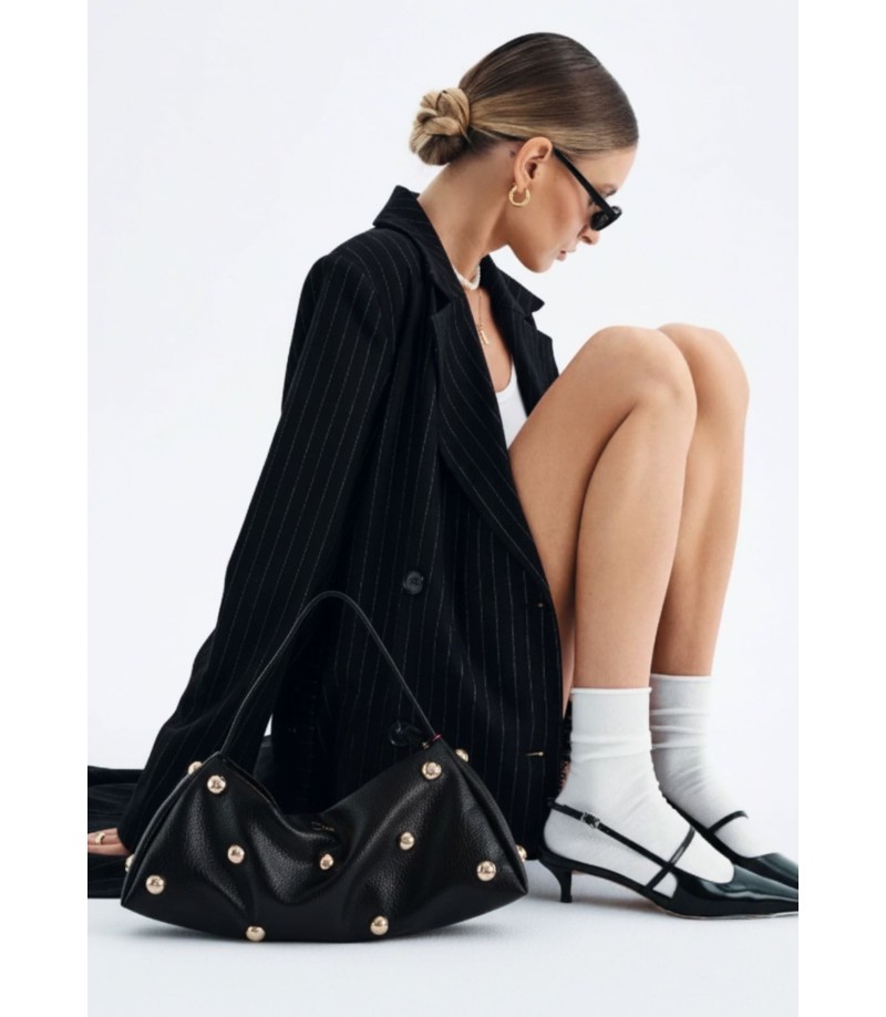 Este bolso baguette de Noco, confeccionado en piel vegana ultra blanda, es una pieza llamativa y muy especial que eleva cualquier look. Su diseño alargado y estilizado se realza con maxi tachuelas doradas, un detalle protagonista que aporta carácter, fuerza y un aire sofisticado muy actual.
