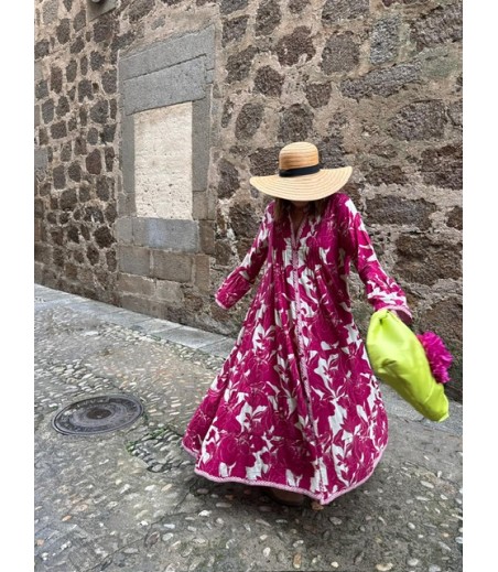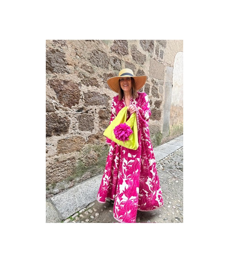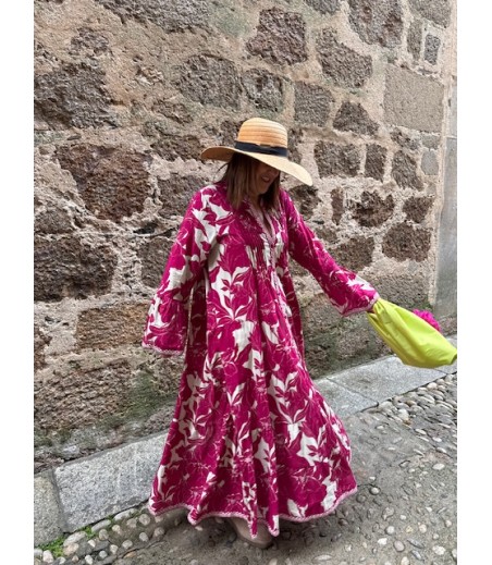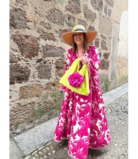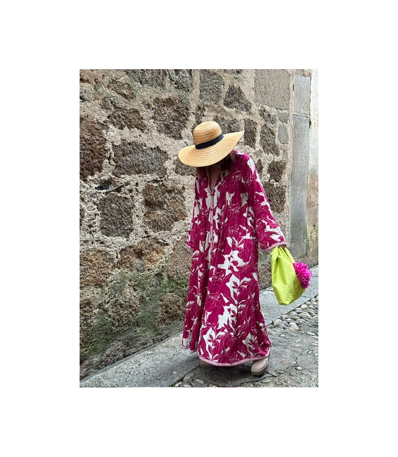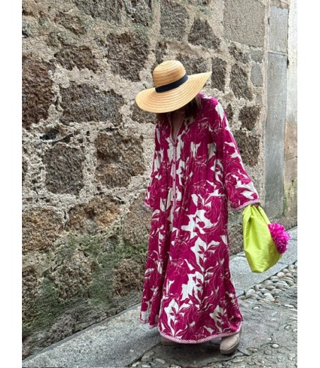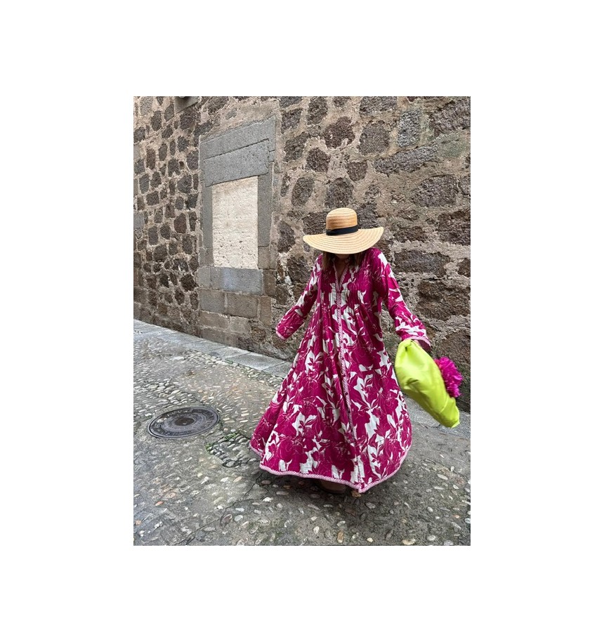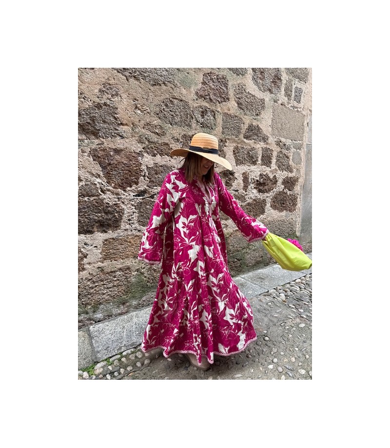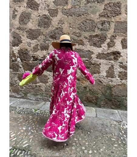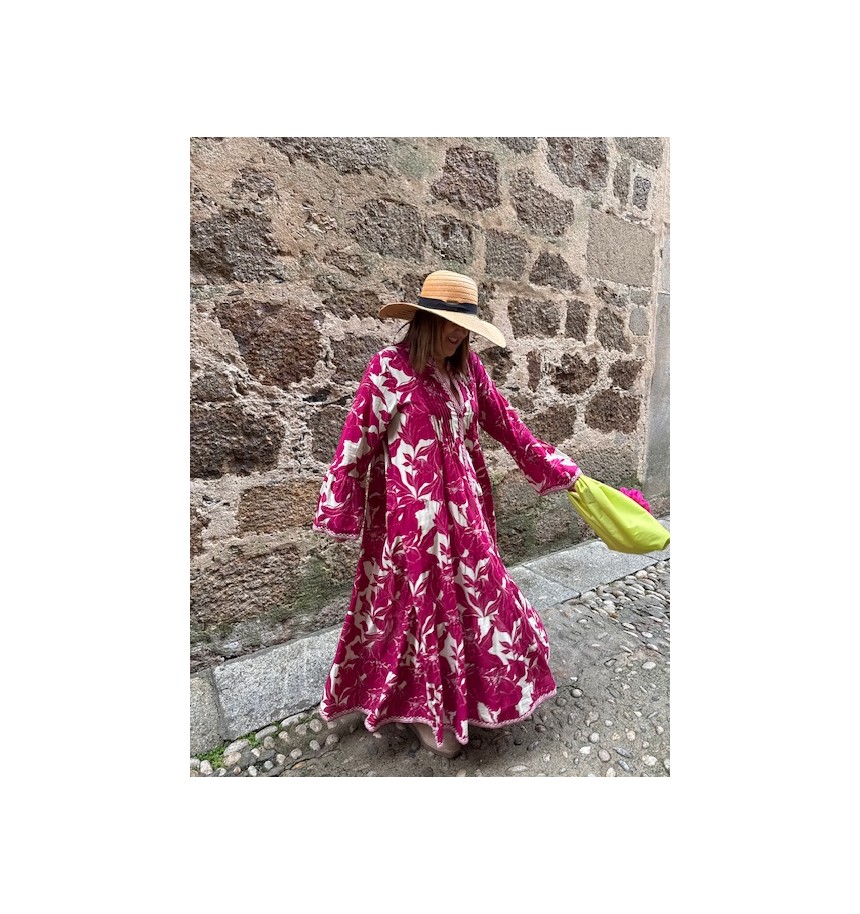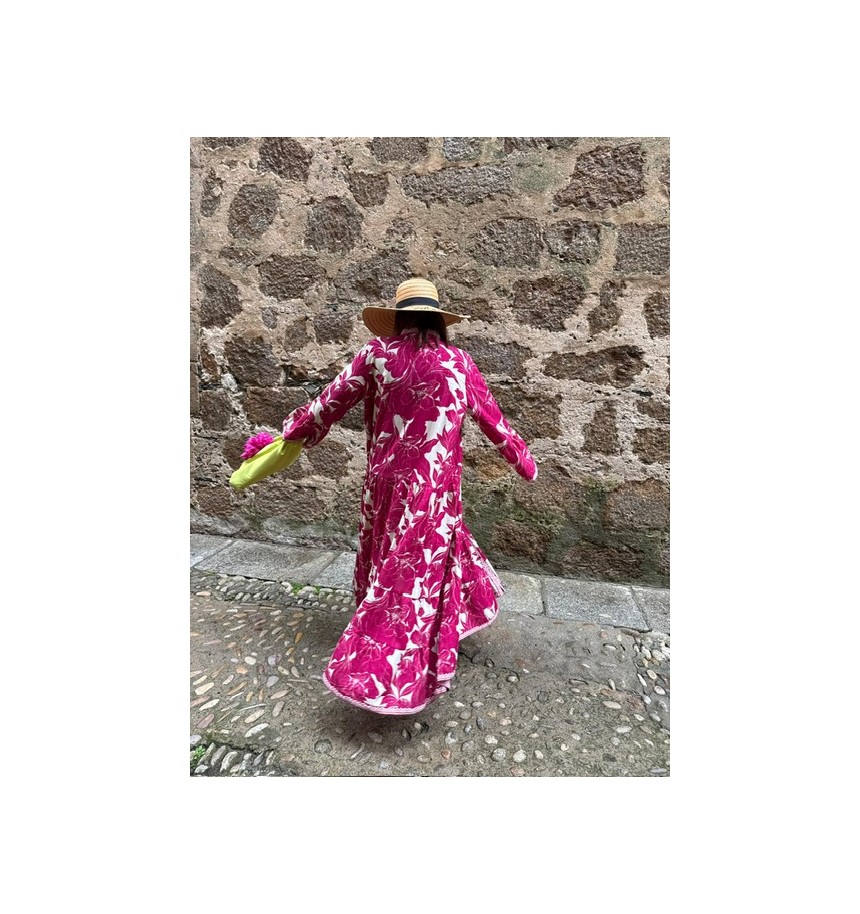 Presenta un escote en V y se cierra con botones en la parte delantera